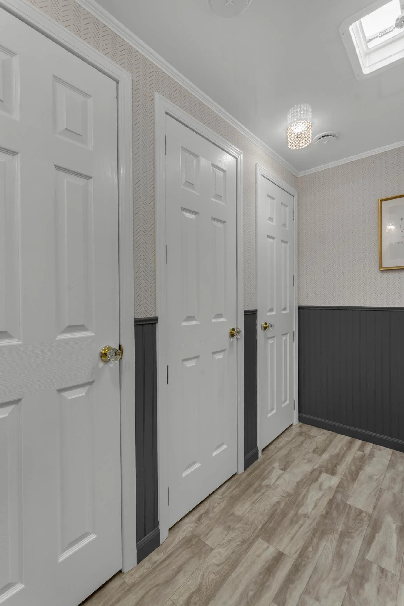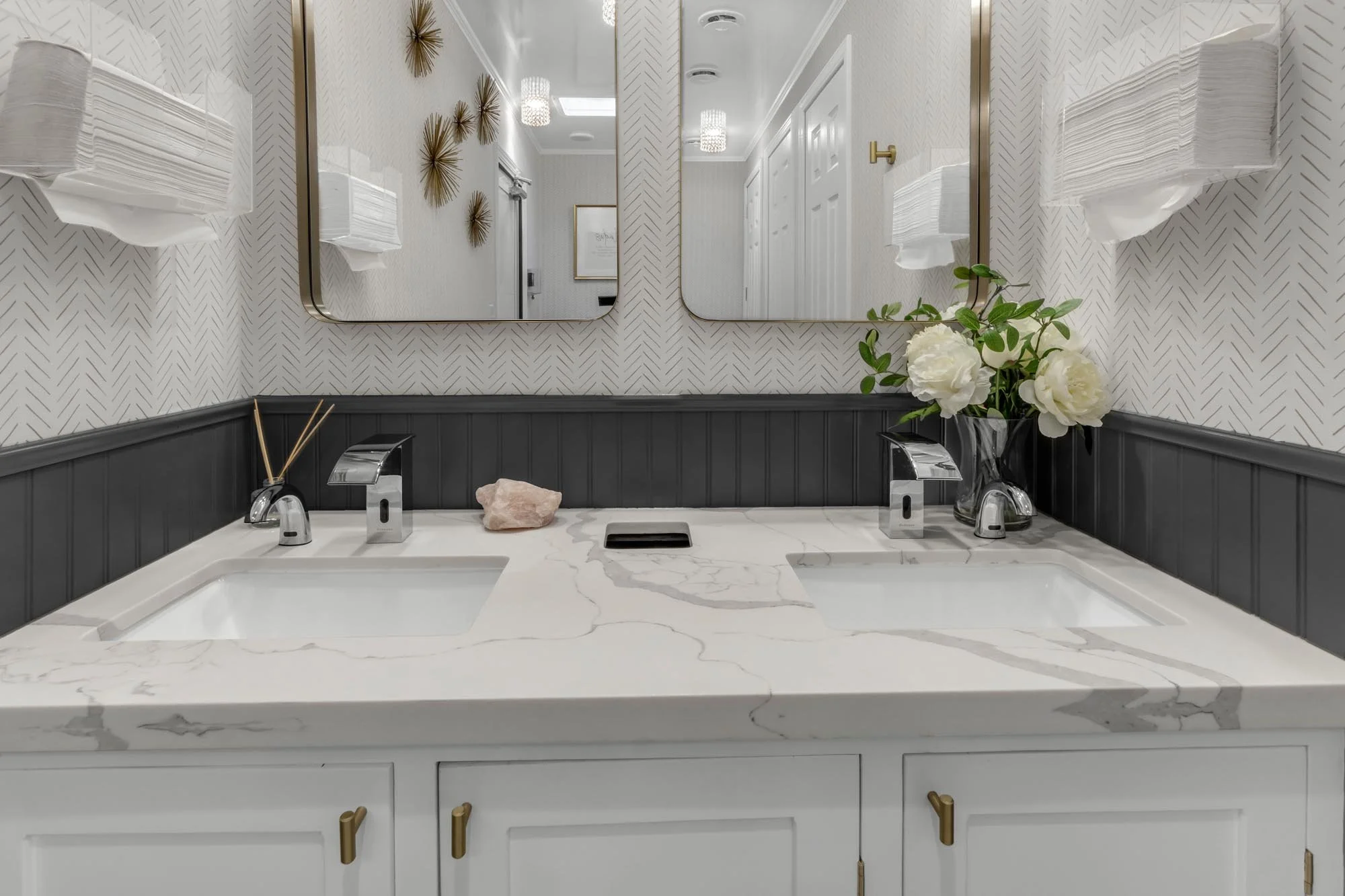 The Ladies Powder Room (3 Private Stalls, Dual Sinks) is a welcoming contemporary and modern estate but with a light and airy take on design. It features wainscoting throughout the space, feminine chevron patterned wall-covering, uplifting quoted art in each stall, quartz countertop, dainty brass knobs, floral arrangements, and beautiful flush mount chandeliers.