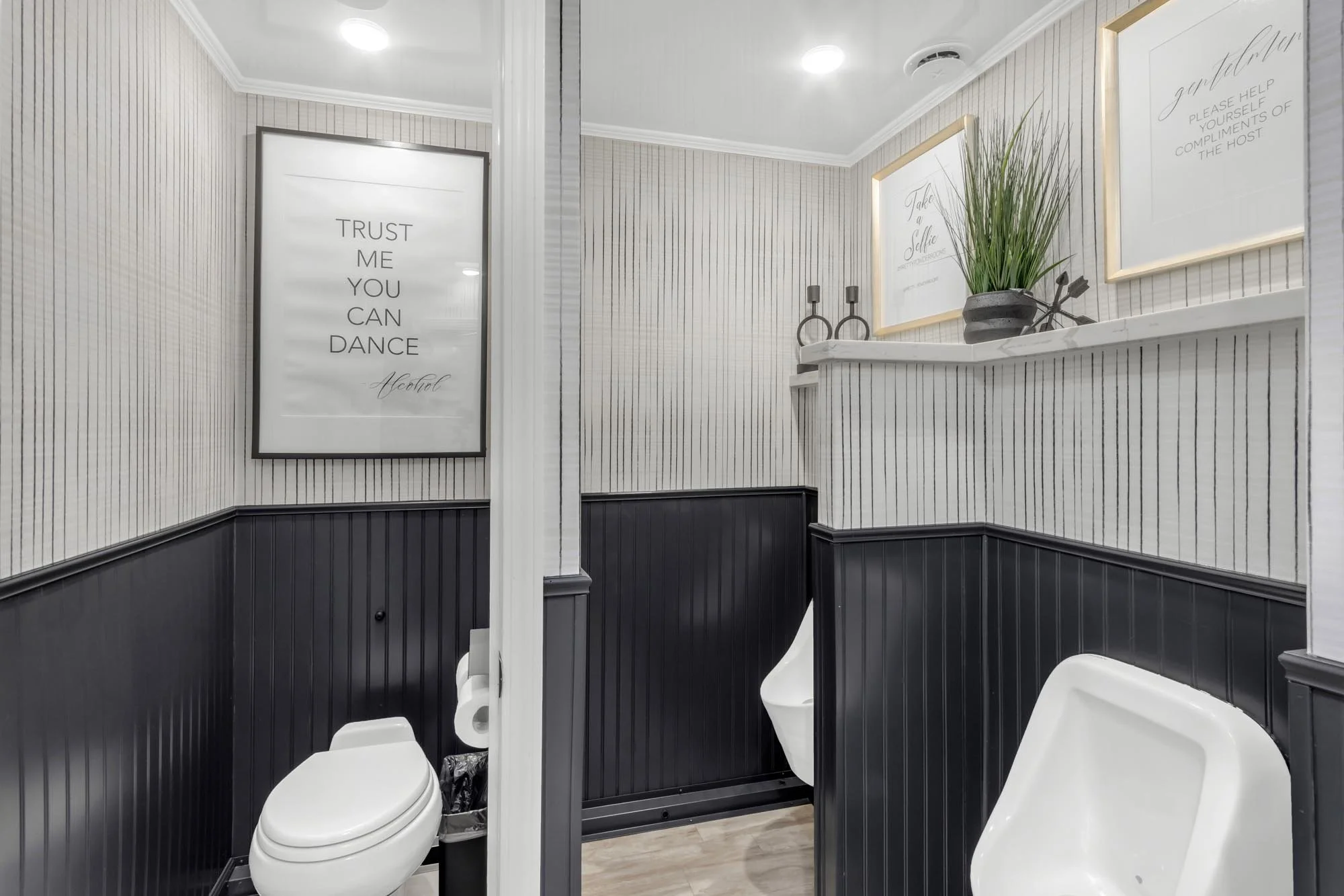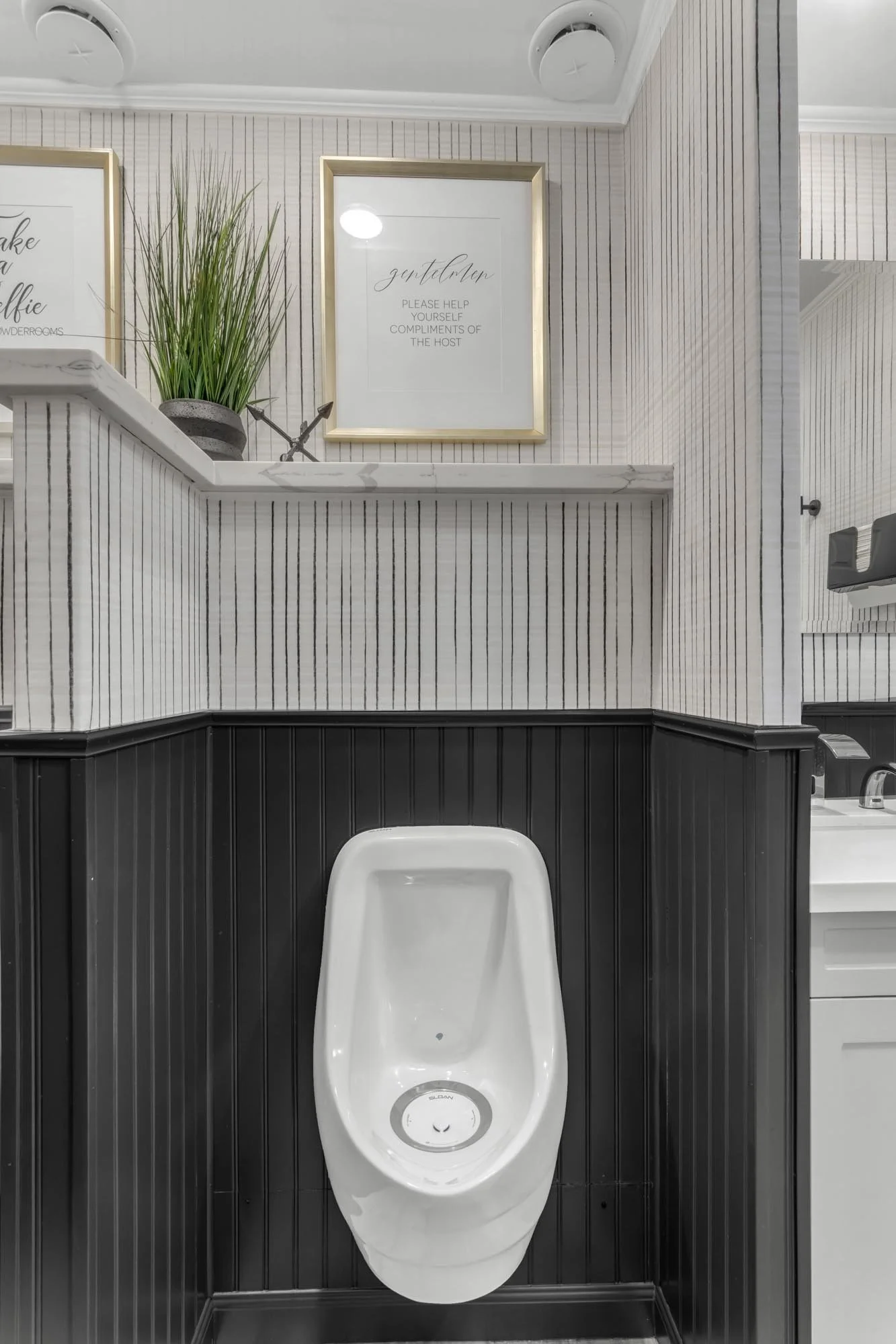 The Men’s Powder Room (1 Private Stall and 2 Urinals) has a contemporary modern feel that welcomes guests into an elevated bathroom experience. It features a sophisticated striped suited wall-covering, contrasting sleek black wainscoting, quartz countertop, slight hints of brass, and uplifting accessories to harmonize the space.