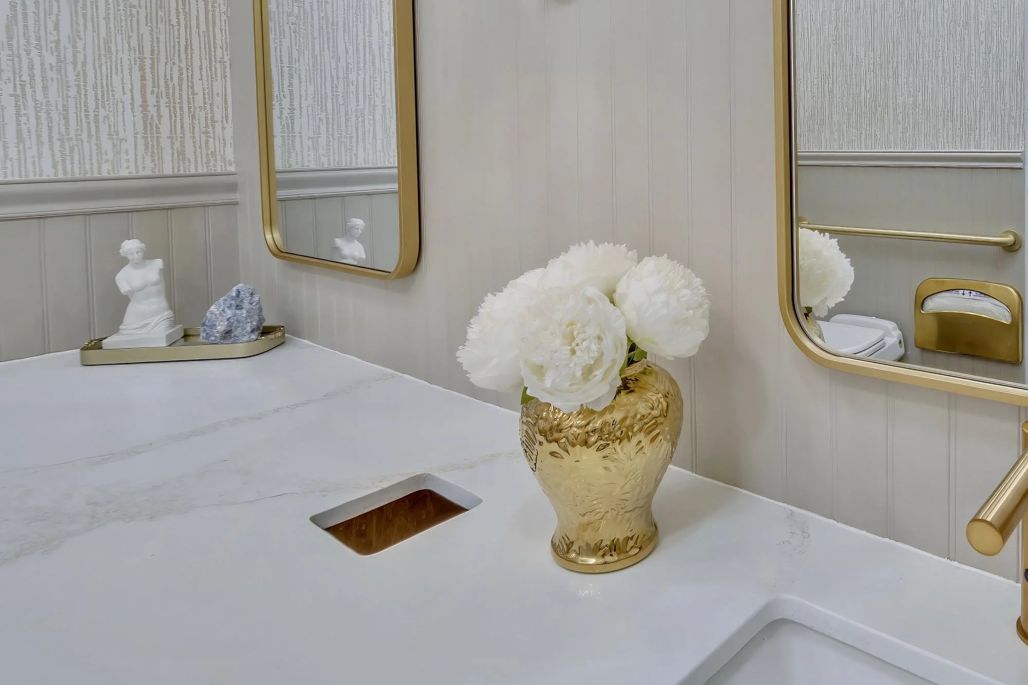 Spacious, wheelchair-accessible trailer suite available for rent with ramp entrance. The Palazzo blends vintage flair with a touch of artistic edge. Our wheel chair accessible space prioritizes inclusivity while exuding aesthetic charm. Traditional elements, soft warm paint tones, and sparkling light fixtures work together to create a spacious, inviting atmosphere, ensuring guests feel both relaxed and welcome.